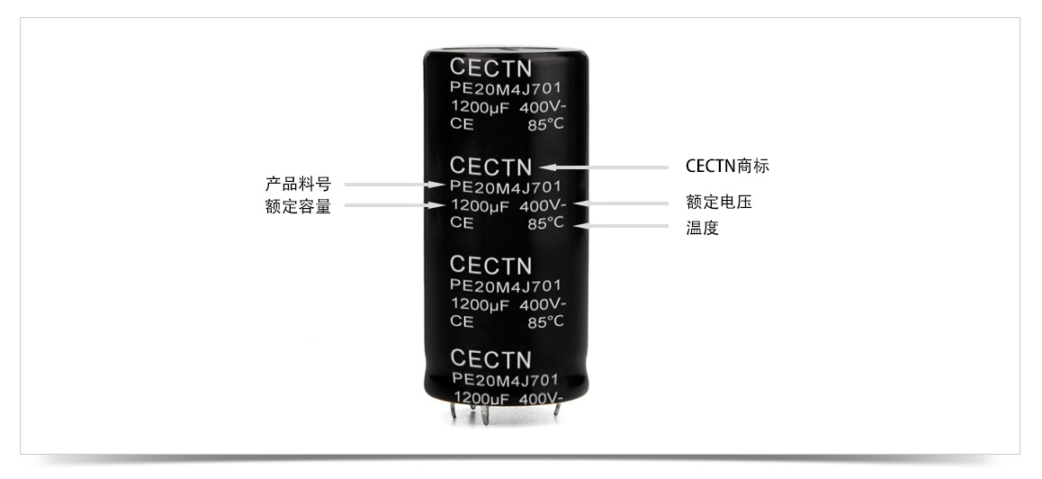 CECTN電解電容印字信息中包含了牛角型電解電容的電壓、容量、溫度、壽命、焊針數(shù)量型號等眾多信息,詳細了解請點擊進入《牛角型電解電容料號說明》頁面。